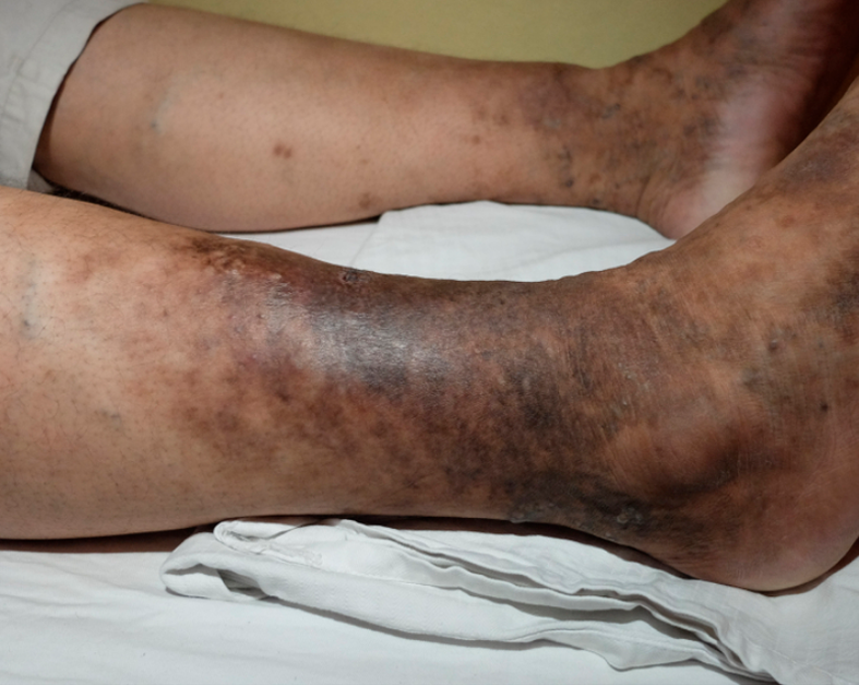 Estadio 2. Venas tortuosas y dilatadas, dermatitis color ocre o pigmentada.