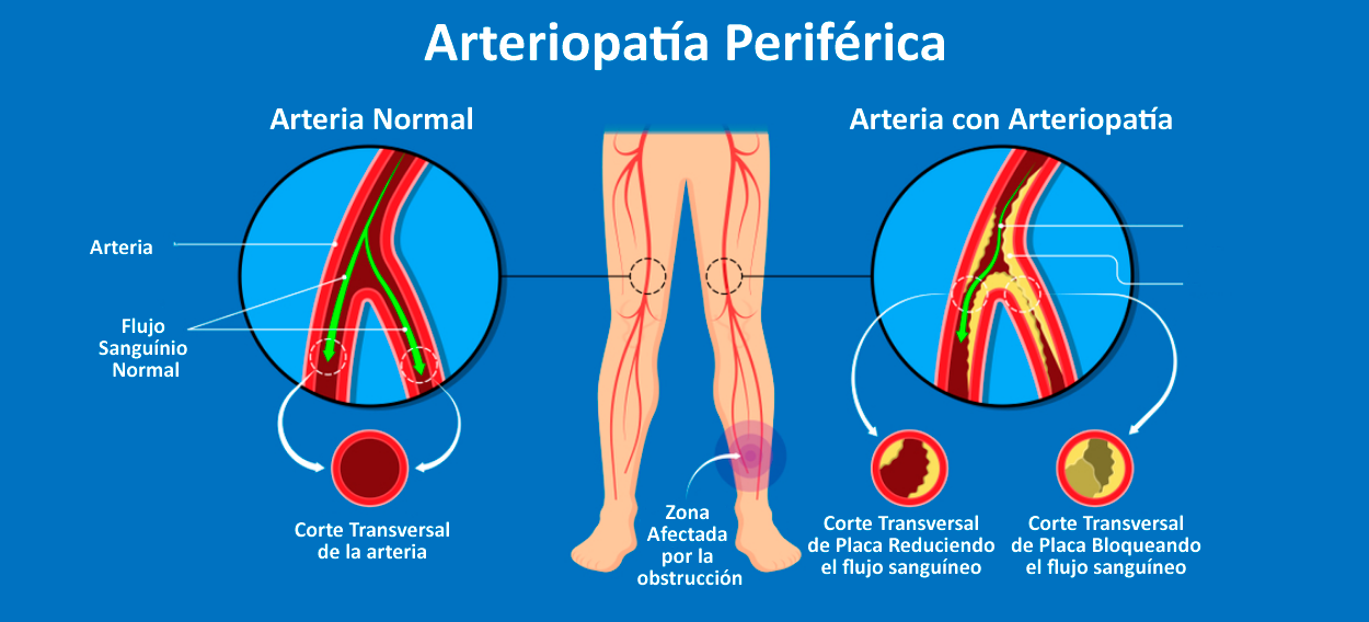 Esta condición se caracteriza por el estrechamiento y el endurecimiento de las arterias que llevan la sangre a los pies y a las piernas, que genera una disminución del flujo sanguíneo. En algunos casos el proceso progresa hasta la total oclusión de los vasos arteriales.